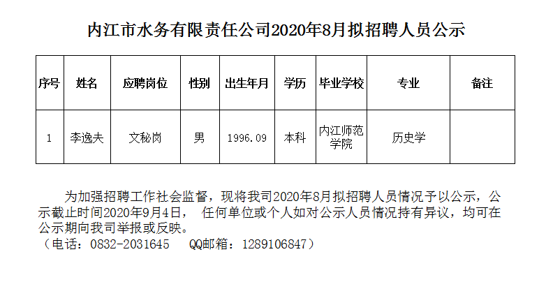 內(nèi)江市水務(wù)有限責(zé)任公司2020年8月擬招聘人員公示