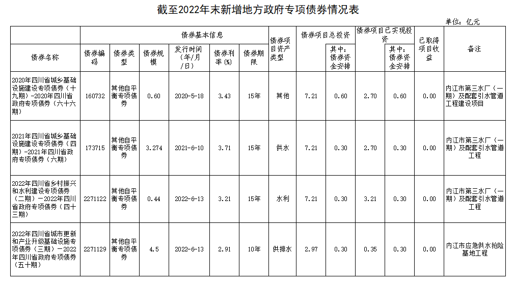 內江市本級截至2022年末新增地方政府債券存續期信息公開(水務)