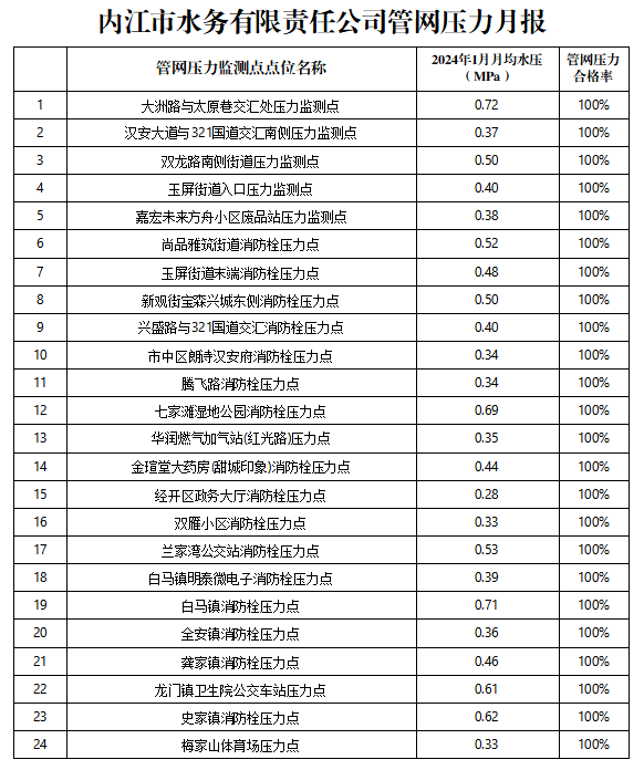 內江市水務有限責任公司2024年1月管網壓力月報