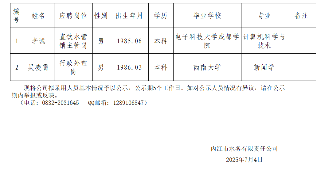 內江市水務有限責任公司2025年7月擬招聘人員公示情況表