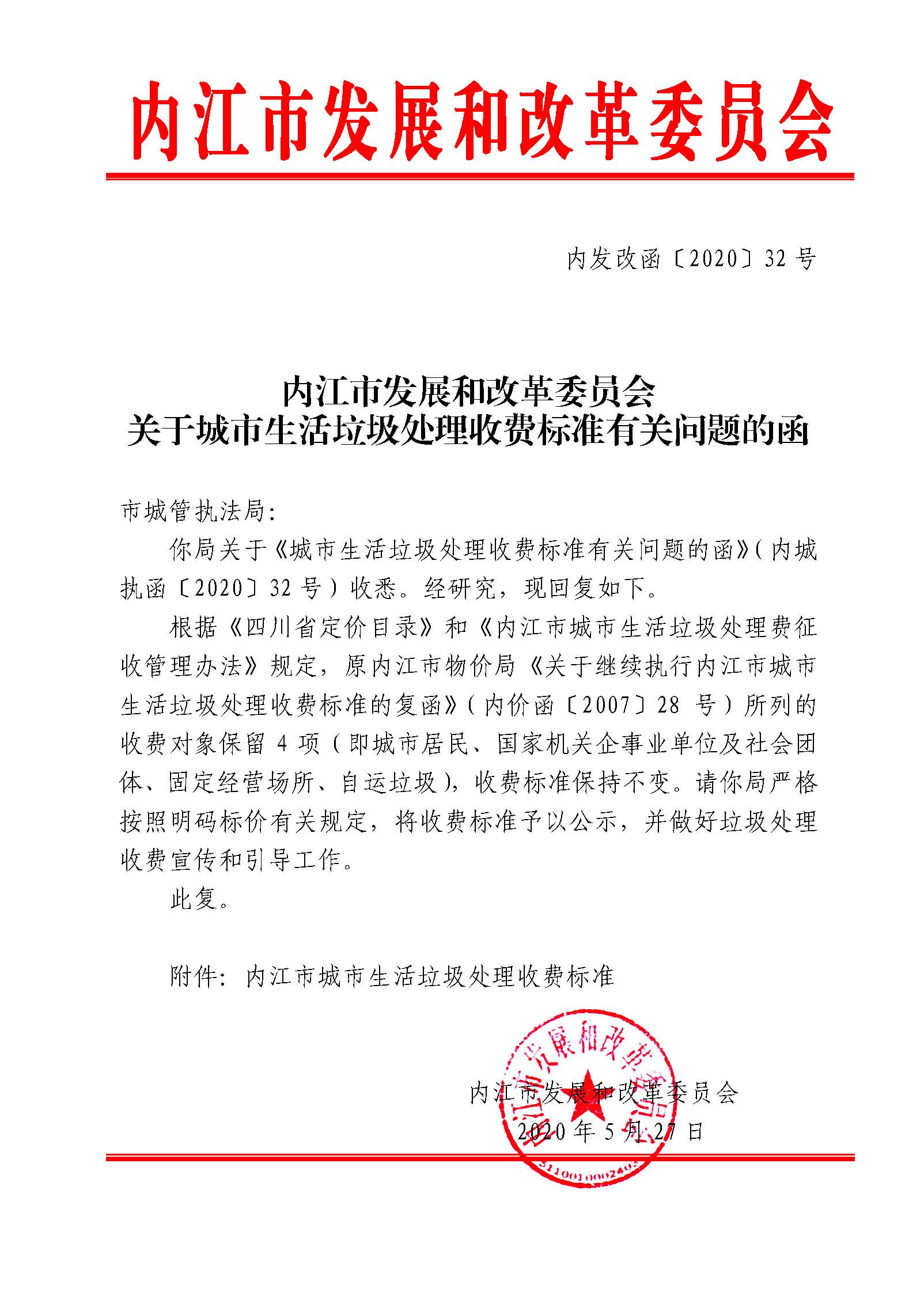 內(nèi)江市發(fā)展和改革委員會關(guān)于城市生活垃圾處理收費標準有關(guān)問題的函