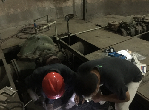 為節(jié)約生產(chǎn)成本,鍛煉員工操作技能,由二水廠員工負(fù)責(zé)對電機基礎(chǔ)加工改造及后續(xù)校正安裝等工作。進入7月持續(xù)酷暑,受上游強降雨影響,沱江原水濁度上漲,二水廠在處置高濁水的間隙,趕往城區(qū)水廠對1#電機基礎(chǔ)的鋼板進行焊接。深井泵房噪音大、空氣流通性差、溫度高,但維修人員不畏艱辛,身穿防護服,花費數(shù)天時間終于完成了電機基礎(chǔ)改造工作。