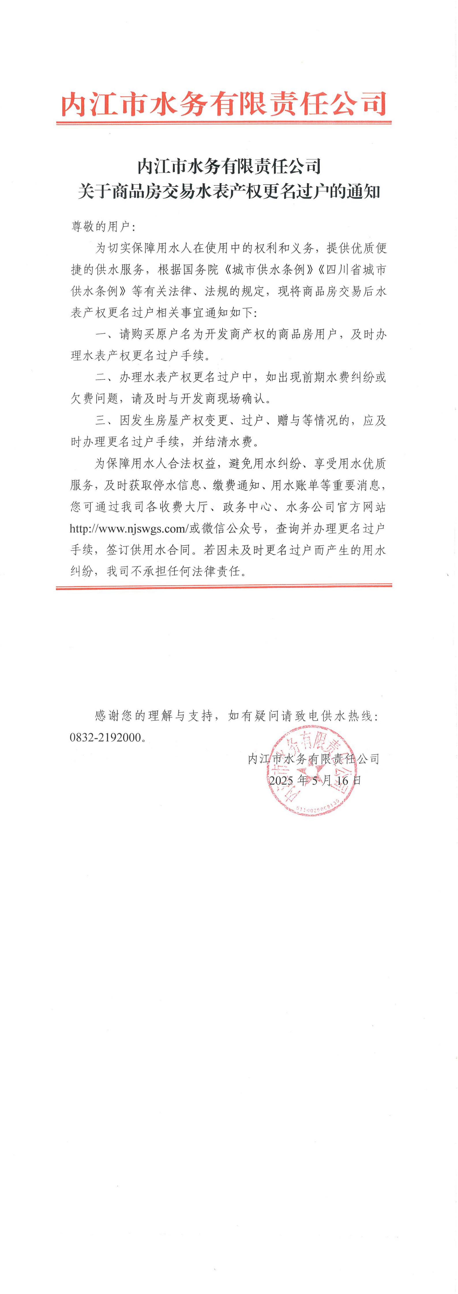內江市水務有限責任公司關于商品房交易水表產權更名過戶的通知
